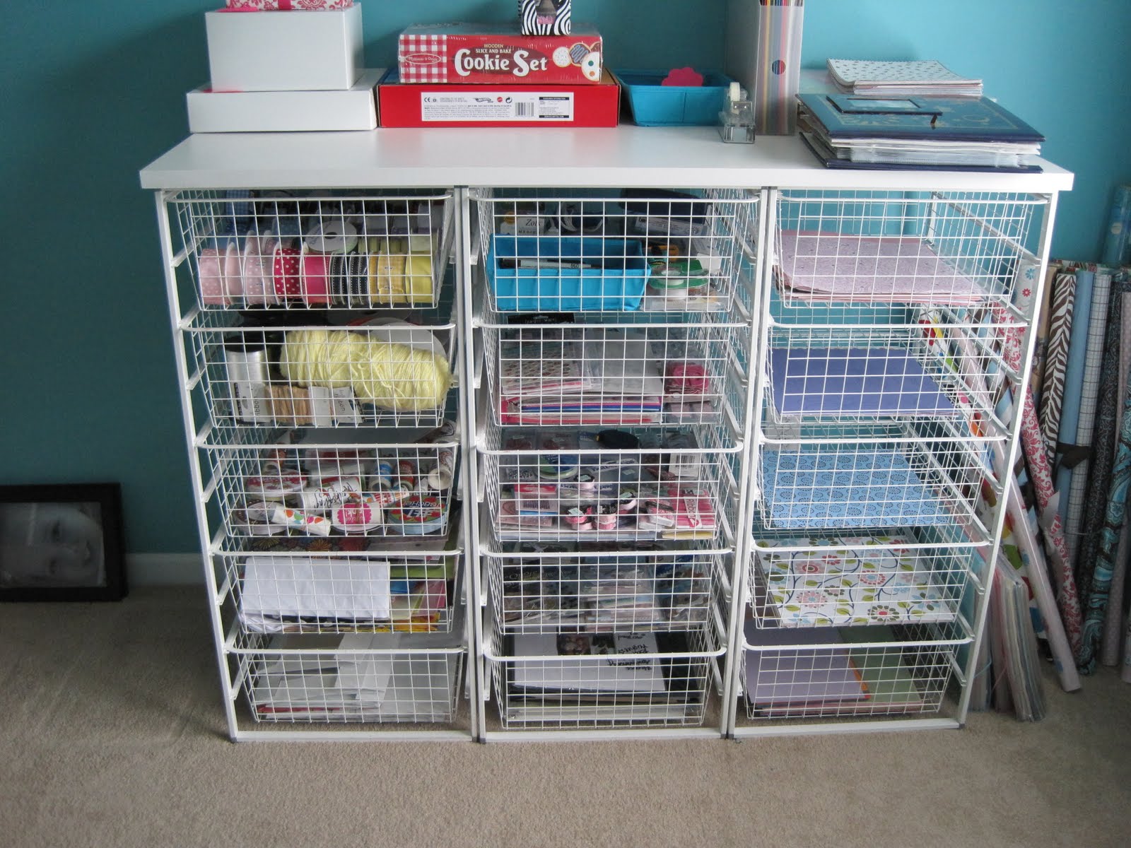 After over 2 years in our house, the "craft room" can now legitimately be called a craft room! There is a lovely shade of turquoise paint on the walls, an amazing elfa shelf storage unit in place, the random shelf on the wall has been taken down, old wrapping paper has been thrown out and random bags of stuff have been sorted. This was a task that I figured would be put off indefinitely, so it feels like a major accomplishment to have it finished. Of course, "finished" is only a relative term- I would still like to add curtains and artwork and a new desk in here, but the main dirty work is done and I will take the rest one step at a time.